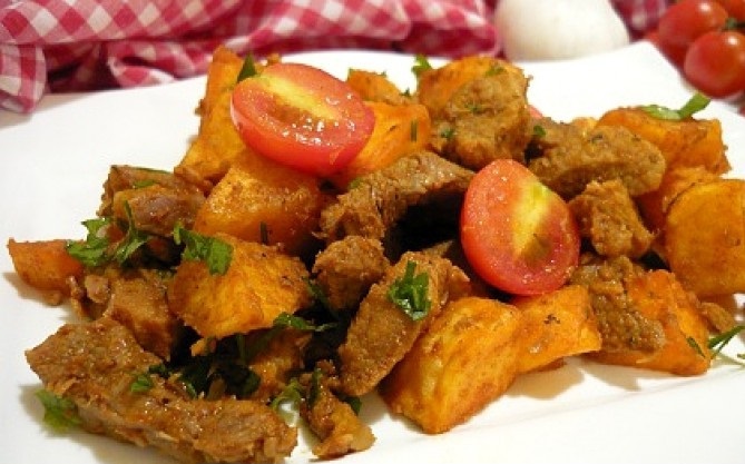 Cigánypecsenyetarja, szalonna, fokhagyma,mustár,ppaprika,bors, krumplihttp://www.nosalty.hu/recept/ciganypecsenye |