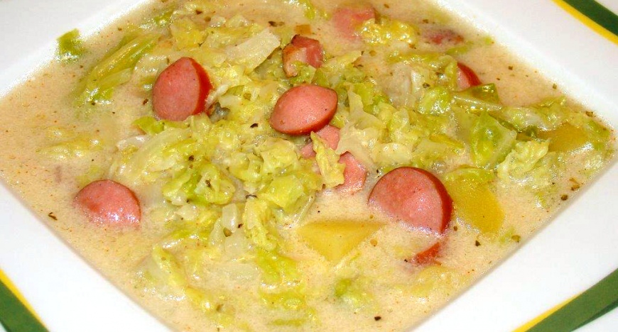 Frankfurti leveskelkáposzta,krumpli,hagyma, kolozsvári,virsli, kömény,tejfölhttp://aprosef.hu/frankfurti_leves_recept |