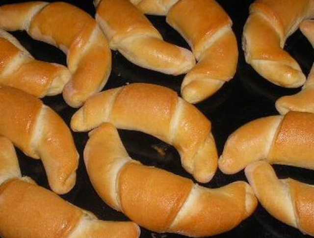 Tejes kifliliszt, rétesliszt, tojás, tej, vaj, élesztőhttp://www.mindmegette.hu/tejes-kifli.recept |