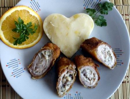 Fuszeres sajttal töltött omlós csirkemellmellfilé, krémsajt, lilahagyma, fbors,fokh,rozmaring,kakukk,bazsalikom, bundahttp://www.mindmegette.hu/fuszeres-sajttal-toltott-csirkemell.recept |