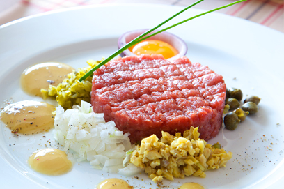 Tatár bifsztek Csendes módra2*darált bélszín, tojássárga, hagyma, vaj, mustár,kethup,paprika,bors,só, kenyér, sörhttp://www.receptoldal.hu/tatarbifsztek_3684 |