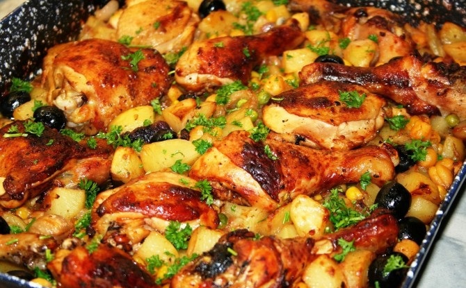 Tepsis csirke (ropogós topogók)dobvero,fuszer, krumpli,hagyma,köményhttp://www.nosalty.hu/recept/tepsis-csirkecomb-zoldsegekkel |
