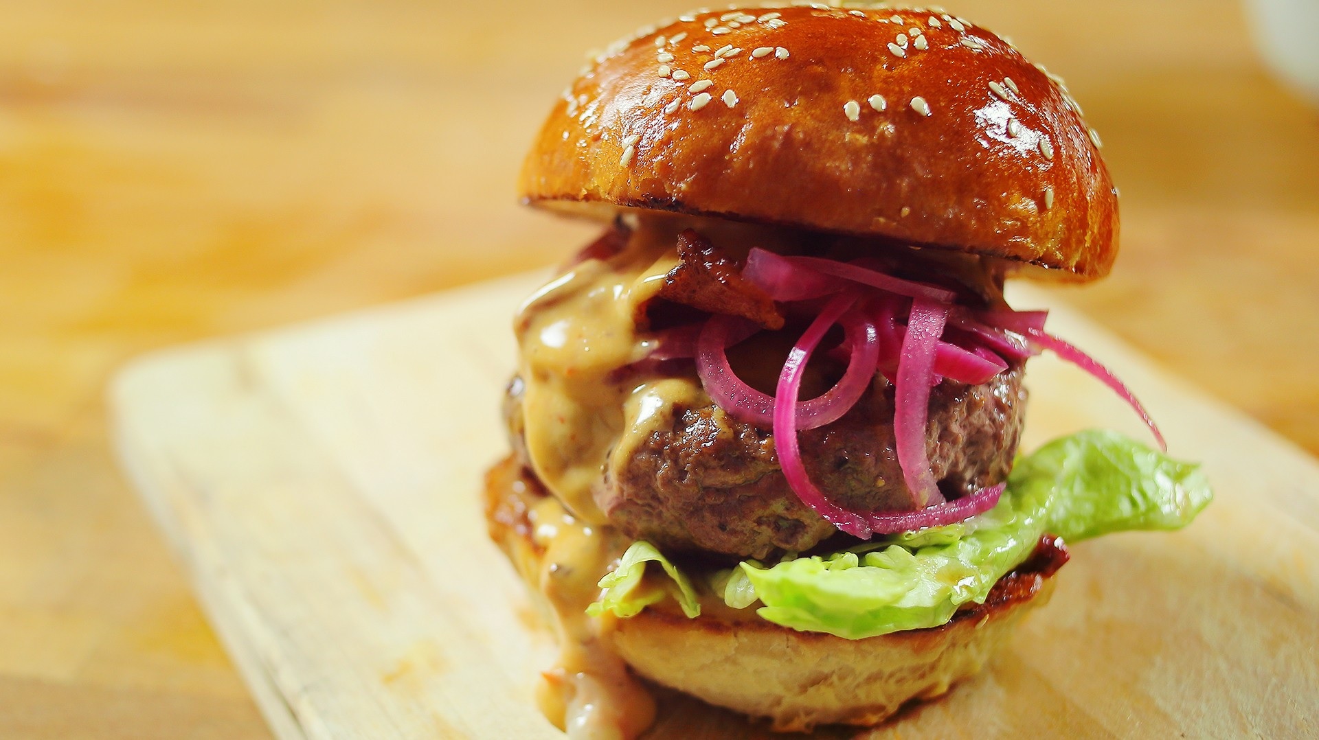 Hamburgerlilahagyma, bacon, mlapocka,mfaggyú, sajt, buci,vaj, majonéz,paprika, salátahttp://streetkitchen.hu/2015/03/15/igy_kell_otthon_hamburgert_sutni |